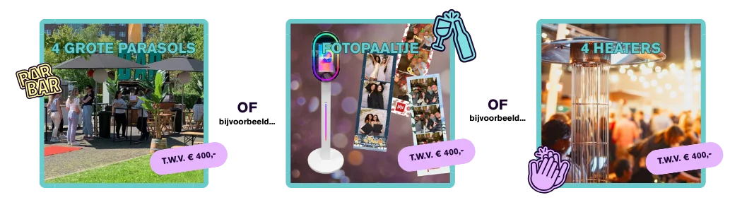 Leggen jullie drie borrels vast? Dan komt daar een add-on naar keuze bij ter waarde van €400,-. Denk aan een extra stukje styling, een food-uitbreiding of iets anders dat past bij het moment en het team.
