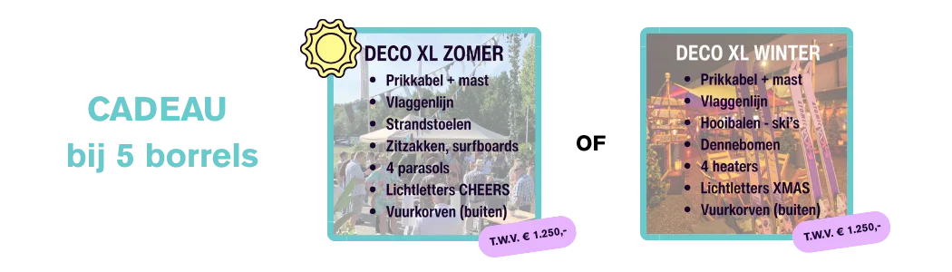 Worden er vijf borrels vastgelegd voor het komende jaar, dan pakken we groots uit met een volledig XL pakket, afgestemd op het seizoen. Zomer of winter: alles is tot in de puntjes geregeld.