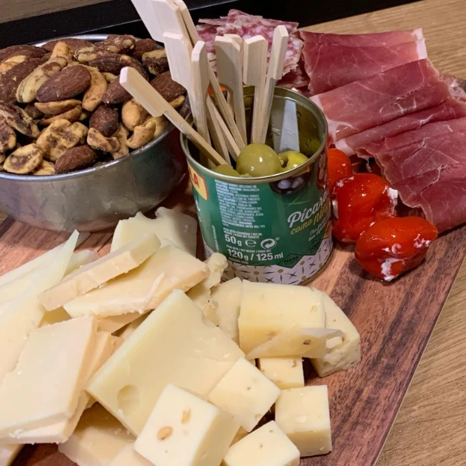 Kaasplank met nootjes, worst en warme hapjes van de traiteur